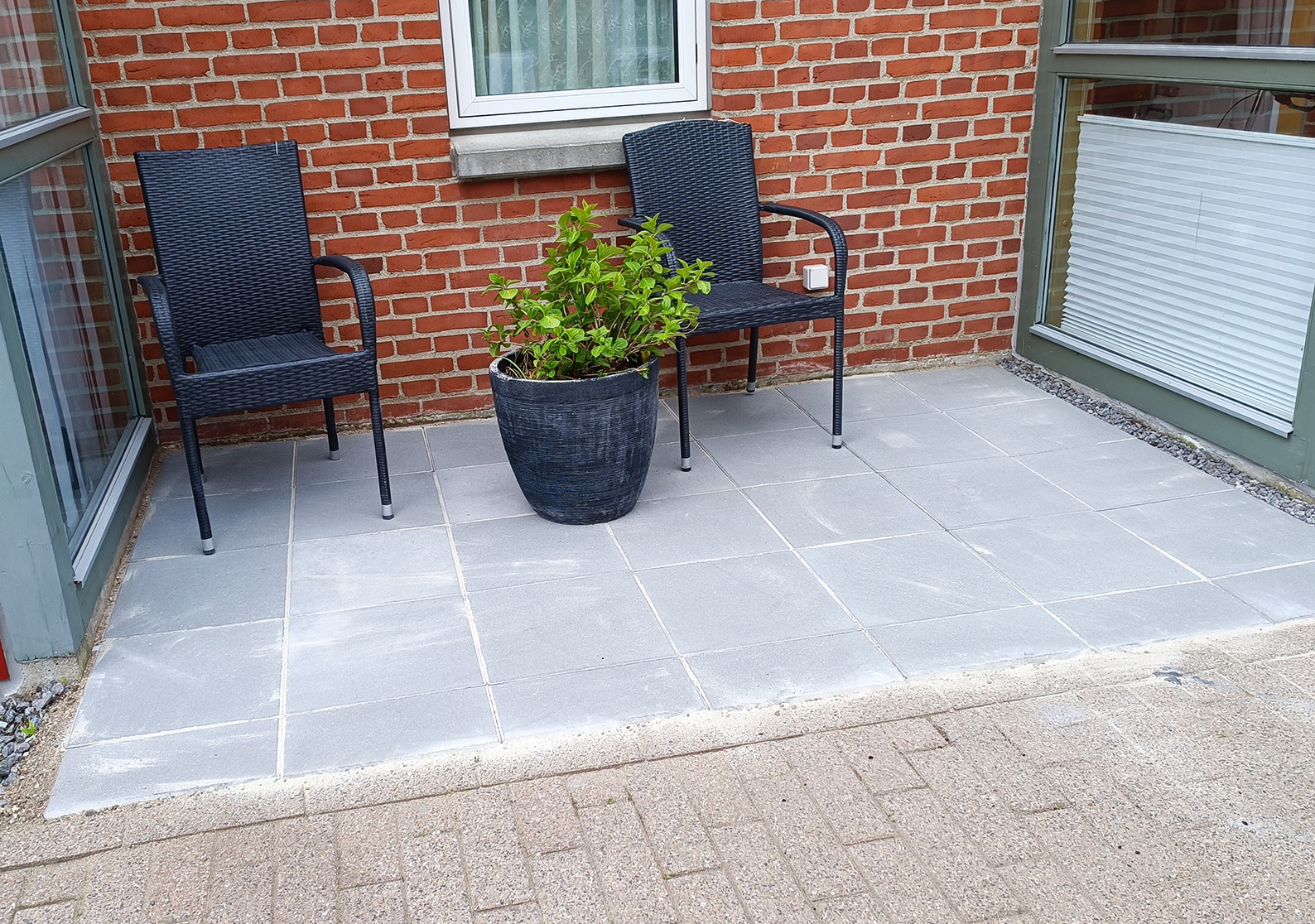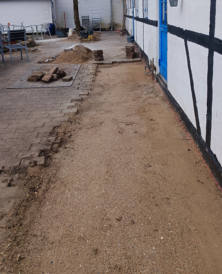 Vi sikrer stabilt underlag med dræn og bæreevne, og afslutter altid med skarpe kanter, jævne fuger og et samlet flot udtryk.